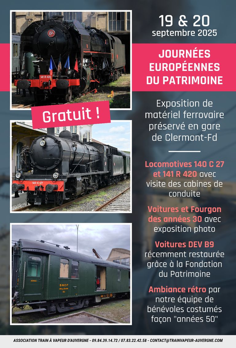 Le GADEFT et le TVA (Train à Vapeur d'Auvergne) seront présent en gare de Clermont-Ferrand les 19 et 20 septembre prochains à l'occasion des JEP SNCF 2025 ! Vous pourrez visitez les cabines de conduite de la 140C27 et de la 141R420 !